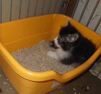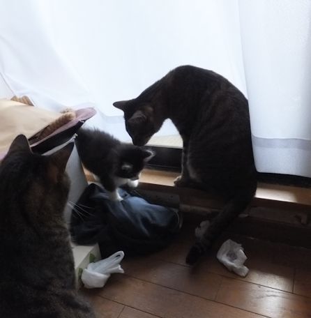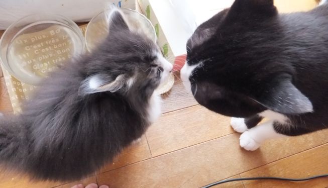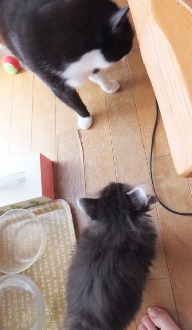 赤ちゃん猫用カリカリを食べて、外で遊ぶ。