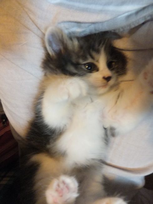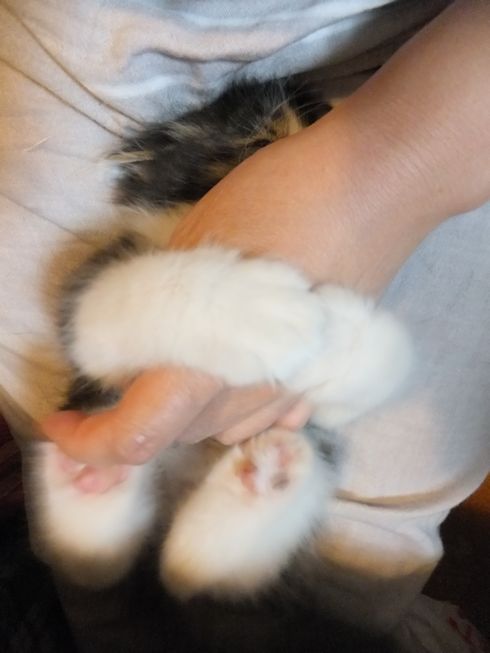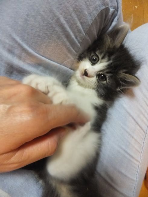 前足ももふもふです。 6/6にんげんが母猫代わりになってきたようで、人目があるととびまわって探検していますが、人が近くにいなくなると、どこかに潜り込んでしまいます。今朝は、犬の散歩に行ってる間に家族が出入りしているうちにもぐりこんでしまいました。もぐりこんですぐだと、他の猫たちがその場所を見ているのでわかりますが、かくれてじっとしていたようで、監視役のかんたも、もうほかのところに行っていました。あちこちさがしていたら、わたしの声を聞いて出て来ました。子猫は母猫がいないときには、声もあげずかくれているので、子猫の本能です。