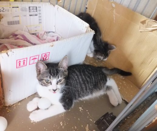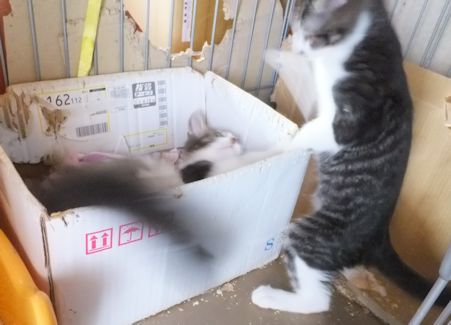 ガブは朝ごはんの後、3きょうだいのケージに遊びに来るようになりました。