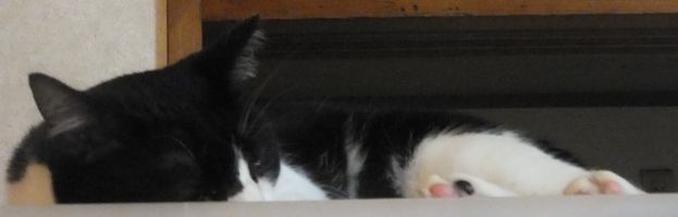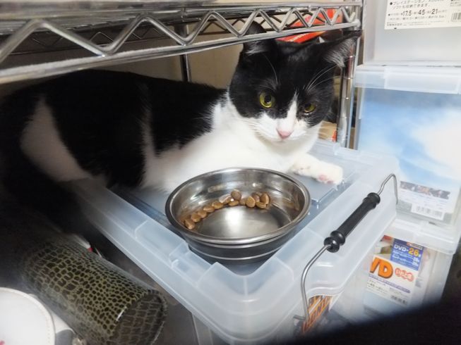 キラクちゃんは奥の部屋の棚で、寝たままごはんを食べていました~