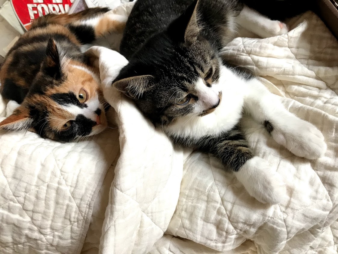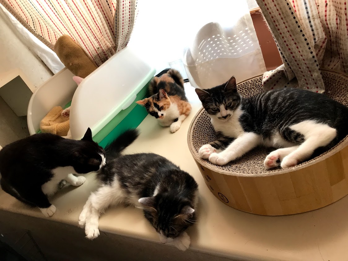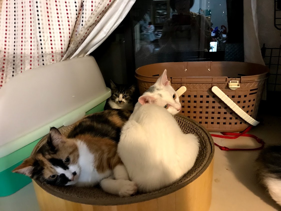 寒くないときには人気の出窓。 ふとんの上も好き。 これは4匹の子猫がいるところ。 奥にシャアがいます。 その不満げな顔はキラクちゃん。こんなに猫がいるって聞いてないんだけど。11月に正式譲渡に行った時には、セイラさんはソファの下に隠れてしまいました。新しいお名前はムギちゃんです。 ムギちゃんのお姉さんは同じような三毛柄でほんとの姉妹のようです。お出迎えもお見送りもしてくれる人好きな猫さん。