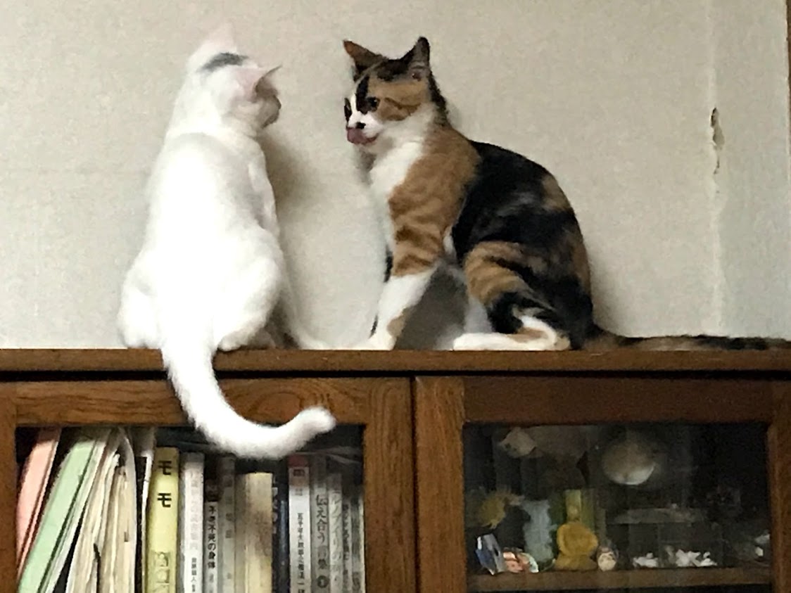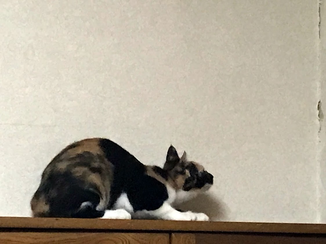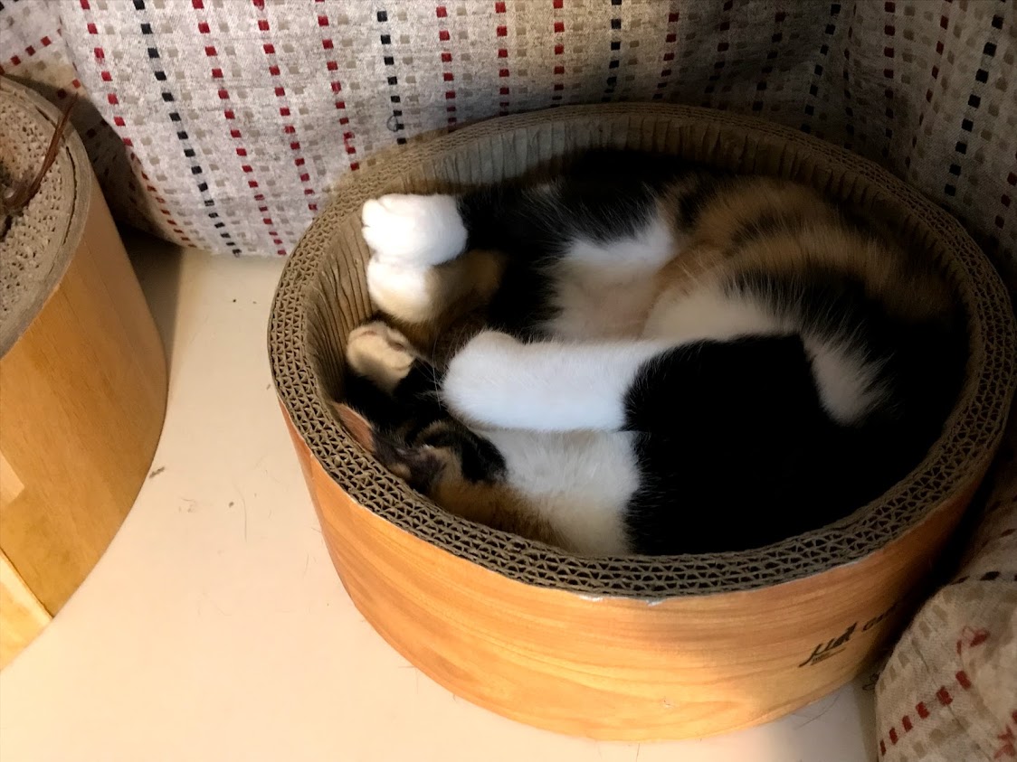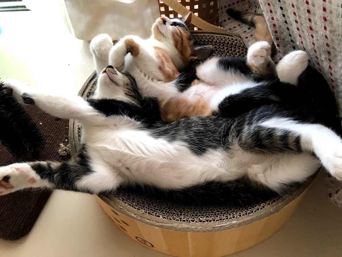寒くないときには人気の出窓。 ふとんの上も好き。 これは4匹の子猫がいるところ。 奥にシャアがいます。 その不満げな顔はキラクちゃん。こんなに猫がいるって聞いてないんだけど。11月に正式譲渡に行った時には、セイラさんはソファの下に隠れてしまいました。新しいお名前はムギちゃんです。 ムギちゃんのお姉さんは同じような三毛柄でほんとの姉妹のようです。お出迎えもお見送りもしてくれる人好きな猫さん。