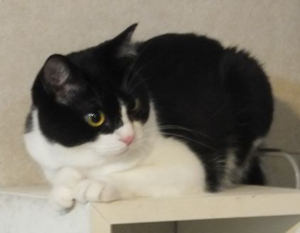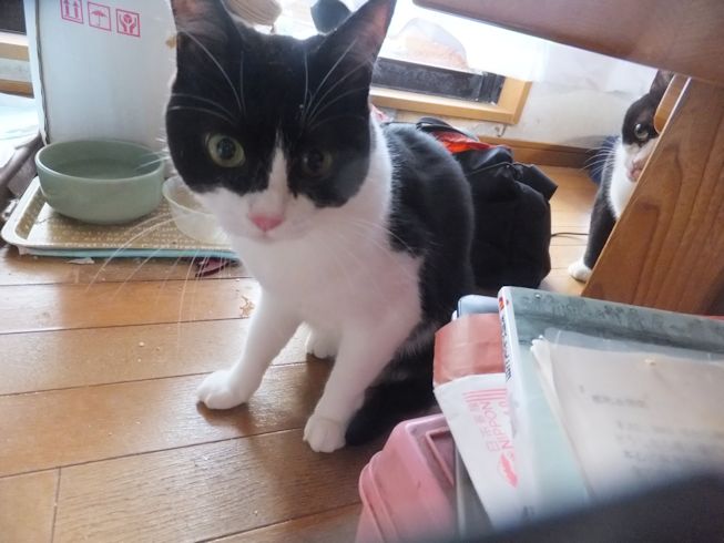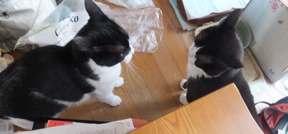 昨日からキラクちゃんがお泊りに来て、11匹の猫と犬の家になりました。不本意だけど仕方ないわ。 後ろからよく似た模様が・・ 鏡かしら。夜、わりとお気に入りのところで。出窓にも進出。朝、苑子がいつもいる奥の部屋の箪笥の上を占領していました。 今日は、子猫の譲渡会でした。子猫4匹、今日も頑張って、ガブとセイラにお声がかかりました。終了後にお迎えに行った時の様子。