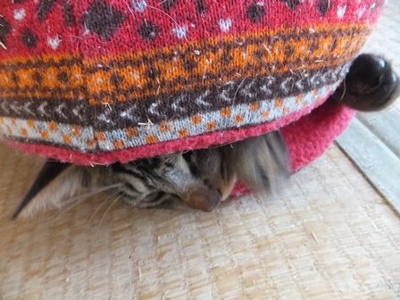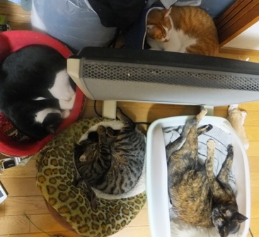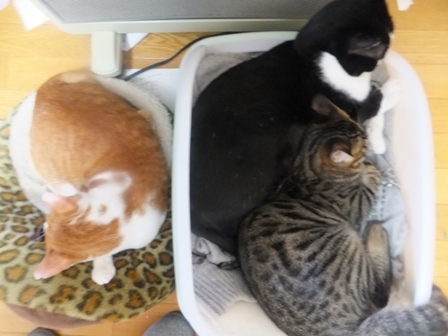 似た色同士のはなとぱたぽん 実はくっつくくらい近くにいることをあまり気づいていない。 しまととは、ぱたぽんにべったり だってママなんだもん これは11月の写真。 今より少し小さいです。 までろんは、こちらがお気に入り。 あぶれる苑子。 気分によって、場所を交換。 オイルヒーターの裏側にもひとつあるので、 実は、みんな入れるのです。 |