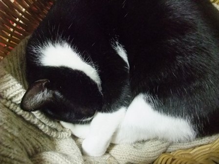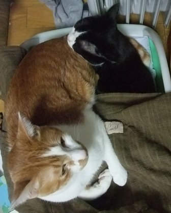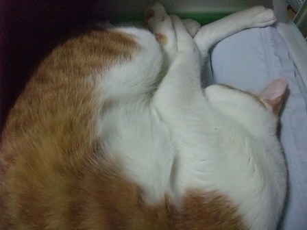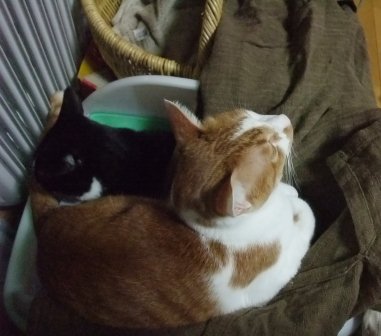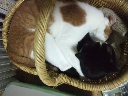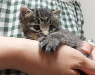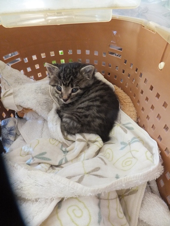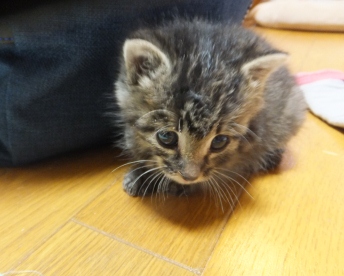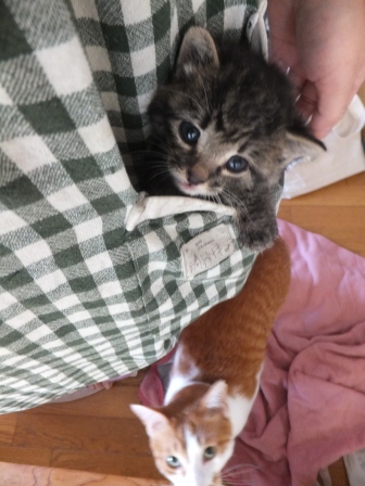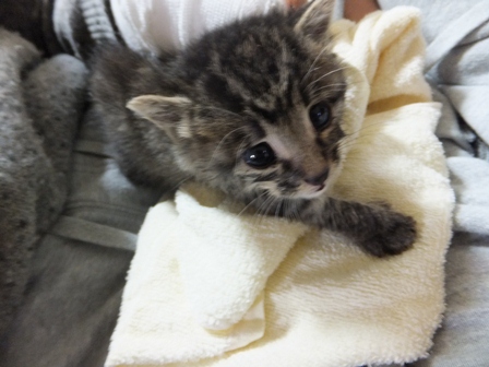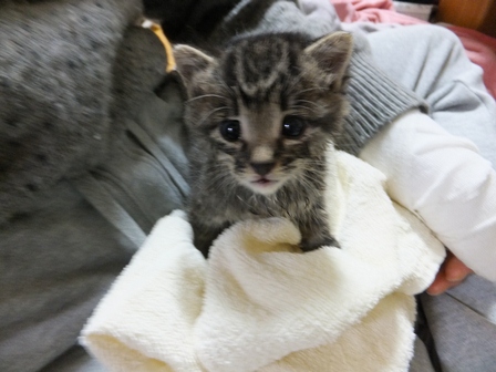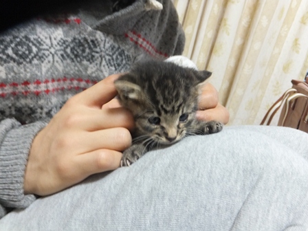 日曜日、お煎茶の先生のお家で子猫を保護したので、こどもと引き取りに行きました。体重260gくらい、生後15~20日くらいでしょうか。とてもきれいなので、昨日捨てられたのでしょう。子猫用のミルクとキャットフードを買ってきました。まだお皿から飲めなかったので、薬飲ませ用の針のない注射器をみつけて、やっと飲ませました。エプロンのポケットに入ります。月曜日、動物病院に行って、大きなシリンジをもらってきたので、ミルクが飲みやすくなりました。ティシュでおしっこをとっていましたが、夕方、トイレに入れたらちゃんとおしっこできました。 ぱたぽんとまでろんは、ずっとおこってます。それでも、までろんは、興味津々で、近くによって眺めています。ぱたぽんは、までろんが来た時みたいに、すっかり隠遁生活で、押し入れにもぐってしまいました。火曜日、ちっちゃい猫は、てとらん と呼ぶことになりました。ものすごくかわいいけど、かなりやんちゃです。ぱたぽんも使っていた、洗面器のトイレを使用。トイレに入れると、遊びたくて飛び出してきますが、したくなると、洗面器の中をくるくると歩き出して、止まると、みぃと鳴きながらおしっこしてます。