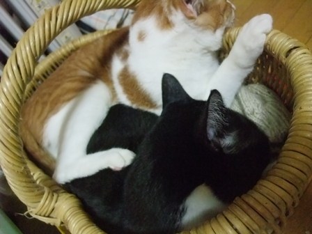 その前から興味深く見守っていたまでろんは、てとらんがうろうろするのをついてまわり、どこかに入りこむと、じゃれています。つめはださずにたたいたり、かかえこもうとしています。てとらんも、までろんは遊んでくれるお兄ちゃんと思ってるようです。からだをおそうじしようとなめていると、あちこち短いので、いつのまにかころがっちゃうてとらん。ぬいぐるみとたたかってみる。