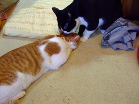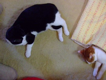 さるろんというほうがよさそうな・・・ からだがやわらかいのです。 新年に台所で、未来を見すえる猫たち ・・・・ ??? ぼくたちの食料の未来は~? ・・・・・ずっとカリカリだよん。 流しのふちに並んで座っています。 |