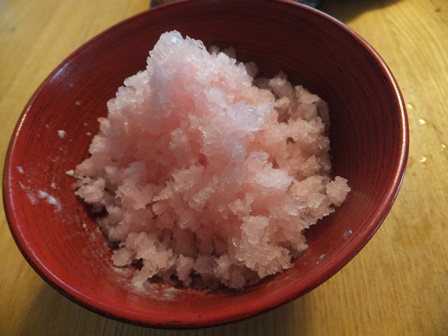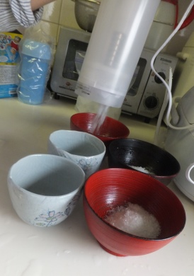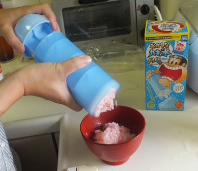 猛暑が去って、暑いけど、猛暑ほどじゃないねと言っていた8月、8月の終わりになり、いきなり涼しくなりました。窓を閉めないと冷える夜もあるくらい。夏休みもあと数日、「過ぎ去る夏を惜しむかき氷の会」と称して、Yukaさんちにおじゃましてきました。すごいかき氷器があるのです。氷を入れて、スイッチを入れると、しゃりしゃりとしたからでてくる~ あっというまに、練乳&小豆 あっというまに、ココナツミルクタピオカ、タロイモも入ってます。どちらもおいしい~ さらに、ガリガリ君のかき氷も! これは手動で、ゴマすり器みたいな感じで上をまわすと、だいこんおろしのような歯で、ガリガリ君がかき氷になって出てきます。棒までおり下ろさないように、真ん中には、棒がそのまま出てくるくらいの穴が開いています。ガリガリ君、スイカ味のかき氷です~♪なし味とかもよさそうです。おやつのあとは、HikariちゃんとArataくんと遊びました。楽しかった~また遊んでね♥