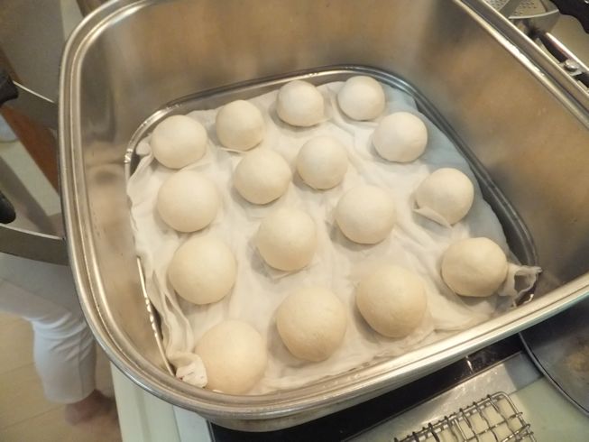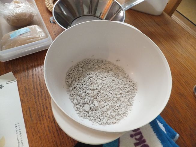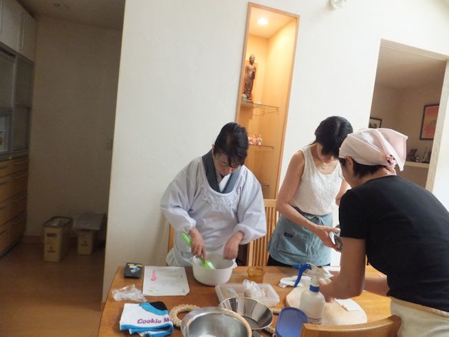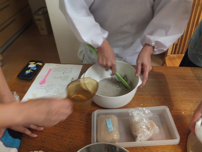 9月の初め、和菓子名人のバジルさんの和菓子作りの会。集まったのは、生活クラブの組合員で、もとはみんな単協の違う人たちです。はじめに、練り切り用の白あんを丸めたり、練りきりの生地を作ったりしました。その間、わたしはお昼の準備。といっても野菜を切るだけ。それでわらび餅を作るところから。100%わらび粉を使った、ぜいたくわらびもち。こんな灰色なんですね。 みんなで作業しているところ。 水を入れると、セメントみたい~とRUBEさん。 電子レンジで加熱して、ぶるんぷるんのお餅になりました。できたてを氷水で冷やして、つまんだら 早くもお昼~重茂のさば缶と野菜を乗せたそうめんと、甘酢味のトマトと卵炒め。みんな生活クラブの消費材です。 晶さんお手製のずんだもちと、おかかもち。 型に入れてわらび餅もかたまりました。 きなこをまぶしていただきました。わらび粉の香りがしておいしい~ 薯蕷饅頭も作りました。素精糖も入って、ほんのり薄茶色です。 蒸してお饅頭にしてから、焼き目をつけて、焼き印を押しました。稲穂ととんぼ。なぜか練りきりの写真は撮り忘れていました~お茶のお稽古にお邪魔して、お抹茶といっしょにいただきました。帰りは、3人で赤羽まで一緒のはずが、池袋ではぐれちゃったり~ホームでakoさんと再会して、同じ電車に乗ったり~楽しい一日でした。当日の様子はバジルさんのブログにも。和のお菓子作り