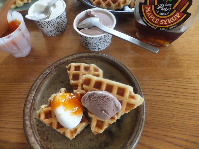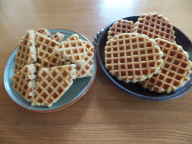 久しぶりに食べたくなって、ホットケーキミックスを使ったワッフル。駅などで売っているのを見かけますが、自分で作ったほうがおいしいので買いません~焼くときに、生地をたくさん入れると、ワッフル型に近い、四角になります。左側。少なめに入れると、丸くなります。右側。 大きく焼いたら、先に切っておいても食べやすいです。 甘いのばかりにしました。バニラアイス、チョコレートアイス、メープルシロップ、手作り杏ジャム、お好みでどうぞ。 フロランタンと同じように、クッキー生地にキャラメルを流して焼きましたが、薄切りアーモンドでなく、ナッツいろいろバージョン。下の生地はホットケーキミックスにオリーブオイルで作りました。甘さもちょうどよいです。 こちらは、くるみだけバージョン。くるみはプレスオールターナティブのものです。上のキャラメルの部分を、もっとぱりっとできないか、試作中です。どちらにしても、うちの家族は大好きな味なので、二日くらいでなくなってしまいます。生活クラブのホットケーキミックスだからほかのお菓子も作れて、このおいしさ。香料を使ったりしている市販のホットケーキミックスでは作れません。・・・パフェの材料いろいろ。クリーム系 バニラアイス、チョコレートアイス、生クリーム。甘い歯ごたえ系 ココア動物ビスケット、ブラックチョコレート。カリカリ系 ミックスナッツ、コーンフレーク。 うちでは、冬の間中、ブラックチョコレートを毎回注文します。りすのように、しまいこんでおいて、夏から秋にもお菓子に使います。そのまま食べても、市販のチョコと比べものにならないくらいのおいしいチョコです。今年の春の最後の注文は、在庫切れになり、ブラックチョコは届きませんでした。もうすぐ生活クラブのチョコレート取り組み再開の季節、忘れずにお好きなチョコを注文しましょう~♪・・・いちじくが好きなのに、家族は煮ても食べないので、パイにしてみました。冷凍パイシートに薄切りいちじくを並べて、オリーブオイルと素精糖を振りかけて焼きました。250度で20分、ちょっと下が焦げましたが、パリッと焼けました。 次は、桃で。パイシートが、まだ半解凍だったのに、いちじくで下が焦げたから、220度で焼いたのでパリッとしませんでした。でもおいしいです。桃を煮て、パイに包むより、簡単。すぐにできます。今度からピーチパイはこれにします。バイシート、また注文しなくては。甘いものだらけですが、一度に食べているわけではありません~♪日々のニュースで、怒ったり悲しんだり、ひどいことばかりなので、甘いものを食べて気を落ちつけます。