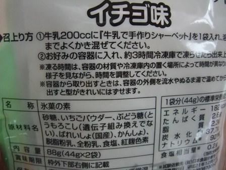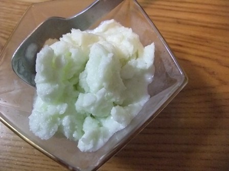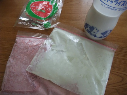 冷たいパスチャライズド牛乳と混ぜるだけでできる、 らくちんな消費材。 でも、冷凍庫がいっぱいで、 製氷皿が入らない、氷作りに忙しい、なんていいうときには、 ジッパー付きの袋で作ってみてはいかがでしょう。 これならどんなすきまでもはいります。 凍ったら、グラスに入れて、おやつにデザートに。 今日はメロン味。 材料も安心です。 |