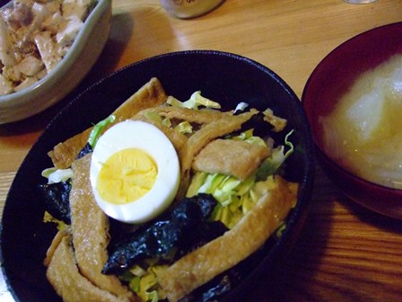 きつね丼ー雑穀入りごはん、キャベツの千切り、のり、甘い油揚げの煮たの、ゆで卵、マヨネーズ