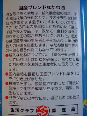 粉と油をさらさらと混ぜたところに水分を加えて、 形作るだけの簡単チョコチップクッキー。 最近の料理やお菓子の本には、自然な素材で作るもので、 こういう素材がいいですよと、説明されているのがよいです。 『オーガニックなレシピノート もっちりシフォン さっくりクッキー どっしりケーキ』 なかしましほ 文化出版局 使われている油は、菜種油。 きび砂糖や、てんさい糖と書かれているのは、 生活クラブの人なら、 それぞれ、素精糖と、ビートグラニュー糖になります。 砂糖大根であるてんさい(甜菜)はビートです。 *** 生活クラブには、サラダ油はありません。 油は単品で、なたね油、ごま油、オリーブオイルだからです。 サラダ油ではなく、なにを使うかと言うと、なたね油。 サラダドレッシングにも使えるし、 揚げ物をしても、油のいやなにおいがたちこめることはありません。 サラダ油と言われている油は、何種類かの油をブレンドしていて、 油をできる限り搾るために、薬品を使って分離しています。 が、米澤製油さんのなたね油は、 薬品を使わずに字の通り圧搾で搾っていて、 湯洗いといって、お湯で洗って分離する方法を開発しました。 以前は、国産の菜種はエルシン酸が多くて使えなかったのが、 低エルシン酸の国産菜種の品種をブレンドできるようになりました。 くわしくはSマーク物語 PR |