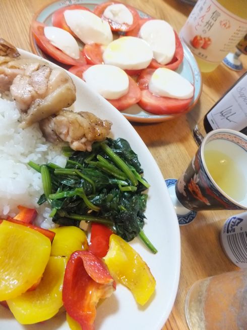 鶏肉のバルサミコ、小松菜ソテー、パプリカ。