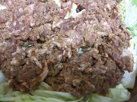 味噌味をつけた豚肉スライスに、米粉をまぶして蒸したものです。