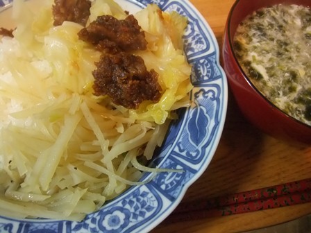 つけあわせは、せん切りじゃがいもの炒めたのと、