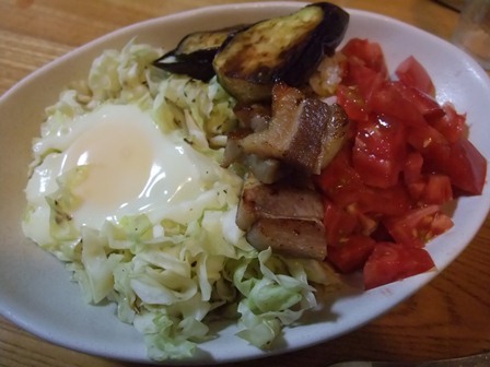 フライパンで焼きながら、すきまになすも並べて焼いて、