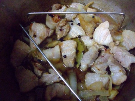 日本酒をふり、水をくわえて圧力鍋で煮ました。