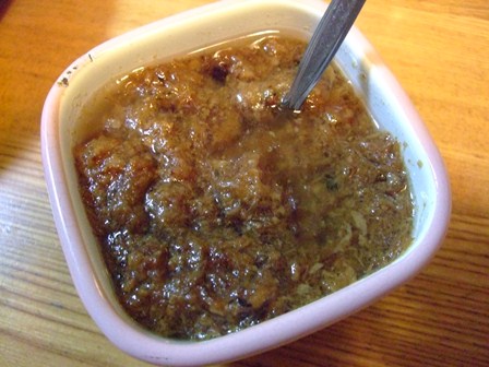 卵、パン粉、くるみ、パセリを混ぜあわせ、ローレル一枚を乗せて