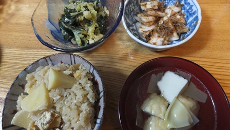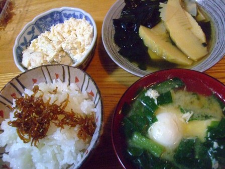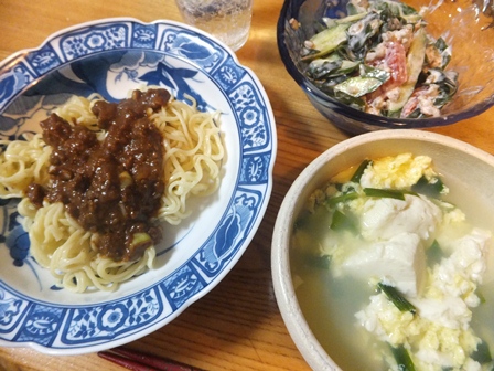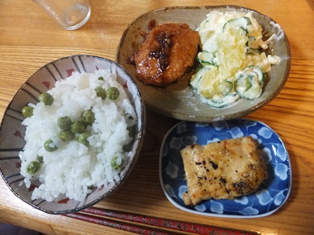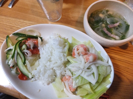 サラダは水菜の残り、レタス、トマト、新玉ねぎ。