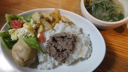 豚ひき肉をかずさちゃんからいただいた愛知の豆みそと練りごまで炒めたもの。