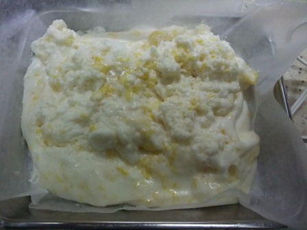 バットにオーブンシートを敷いたところに流して固めます。