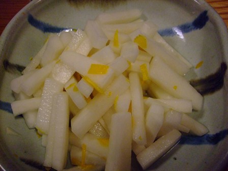 拍子切りにした大根をボウルに入れて、塩を振ります。