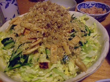 きゅうり、油揚げの焼いたのを刻んだの、ごま、かりかりじゃこをかけて、ごま油をまわしかけました。