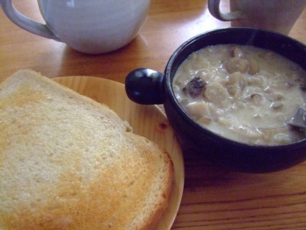 椎茸、ごぼう、玉ねぎ、押し麦のミルクスープ、
