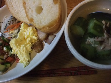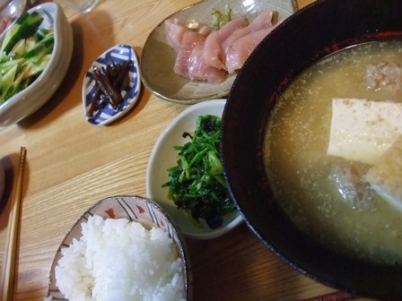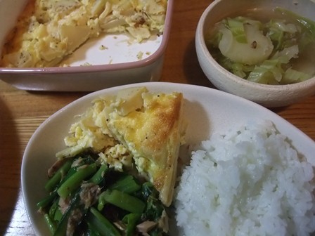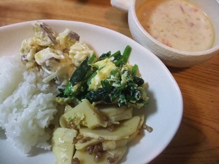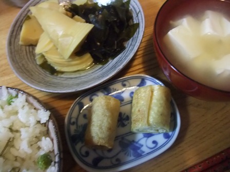 米のとぎ汁と唐辛子を入れて、圧力鍋で下ゆでして、 最初は、にんにく炒め・・3月29日 次は、キッシュにしてみました。 小松菜の炒めたの じゃがいも、玉ねぎ、キャベツのスープ 次は、わかたけ煮。 しろだしとみりんで薄味に煮ました。 グリンピースごはん 豆腐の味噌汁 油揚げの味噌チーズ巻き焼き 生のたけのこはゆでるのが面倒と思いますが、 食べるとやはりおいしいです。 |
