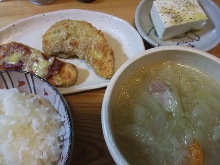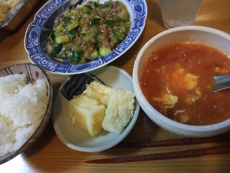たくさん届いたきゅうりで、初めて麻婆きゅうりを作りました。 きゅうりは、角切りにして塩をふり、少し水気を出してから炒めました。 豆腐や茄子と違う、さくさくと歯触りの良い麻婆おかずになりました。 拍子切りにして片栗粉をまぶして揚げた豆腐と、 トマたまスープと。 |