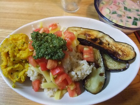 玄米ご飯に、バジルペースト、チーズ、トマトをかけて。