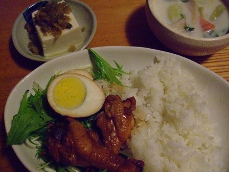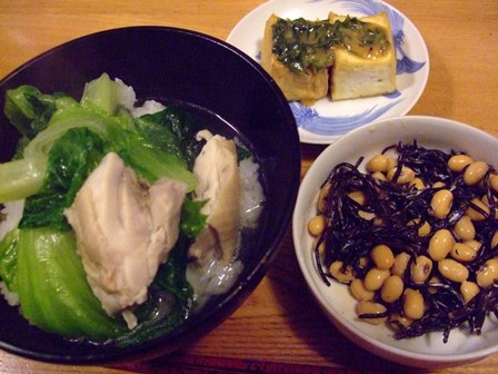 簡単にできる夜ご飯。 鶏肉があったので、ぶつ切りにして、ゆでて、 酒と塩で味付けし、 最後に沃土会のレタスを入れて、 鶏スープかけごはん。 好みでおろし生姜を入れました。 厚揚げの焼いたのに、ネギ味噌のせ ひじきと大豆のサラダ ポン酢マヨネーズ |