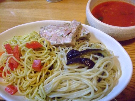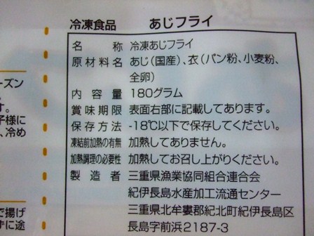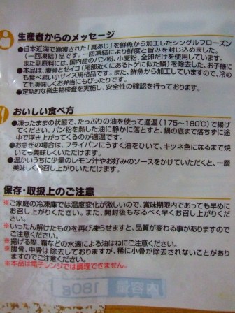 今年初の炒めた長なすのスパゲティ 生のトマトとあえただけのスパゲティ きゅうりと豆腐の冷たいスープ アジフライ なかなかフライを作らないので、 冷凍のアジフライを注文してみました。 家で作るときと同じ材料です。 揚げるか、多めの油でフライパンで焼いても調理できます。 |