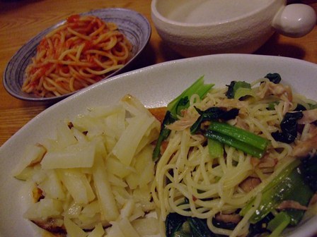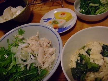 袋を猫にかじられて穴が開いていたので、 鶏肉を蒸しておいたのを、炒めて、小松菜を加えてさらに炒めたのと トマトは、国産トマトの缶詰を少し煮詰めたのに、ケチャップで甘みを付けました。 マカロニのように写っているのは、千切りジャガイモをフライパンで焼いたもの。 スープはごぼうのポタージュスープです。 |