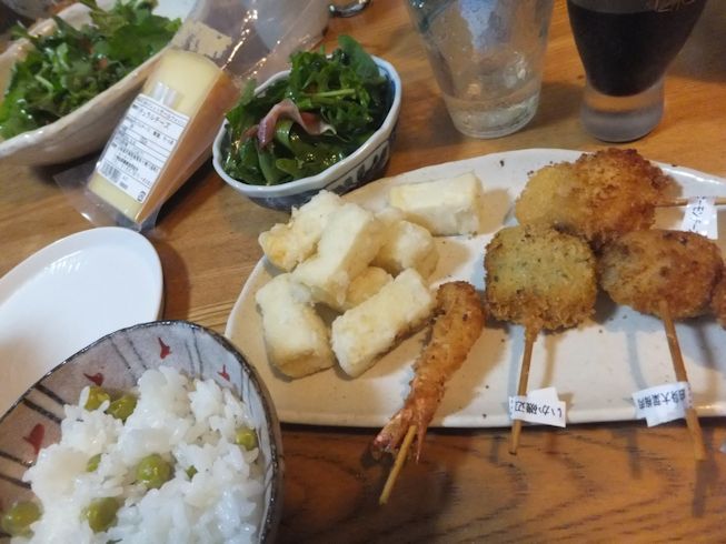 串揚げセットと、豆腐に片栗粉をまぶしてあげました。