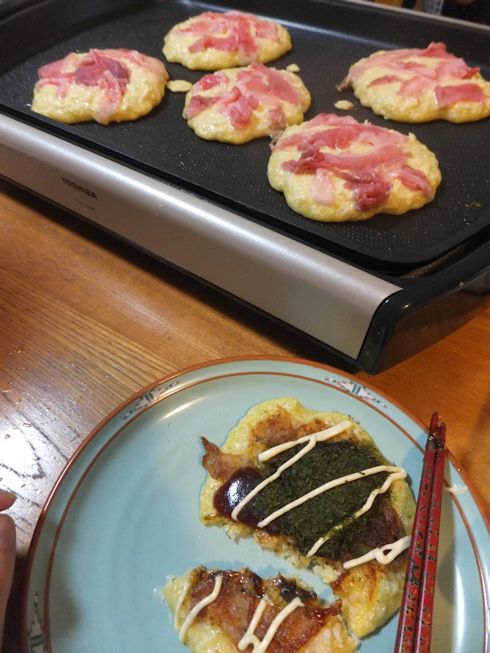 ホットプレートでお好み焼き。